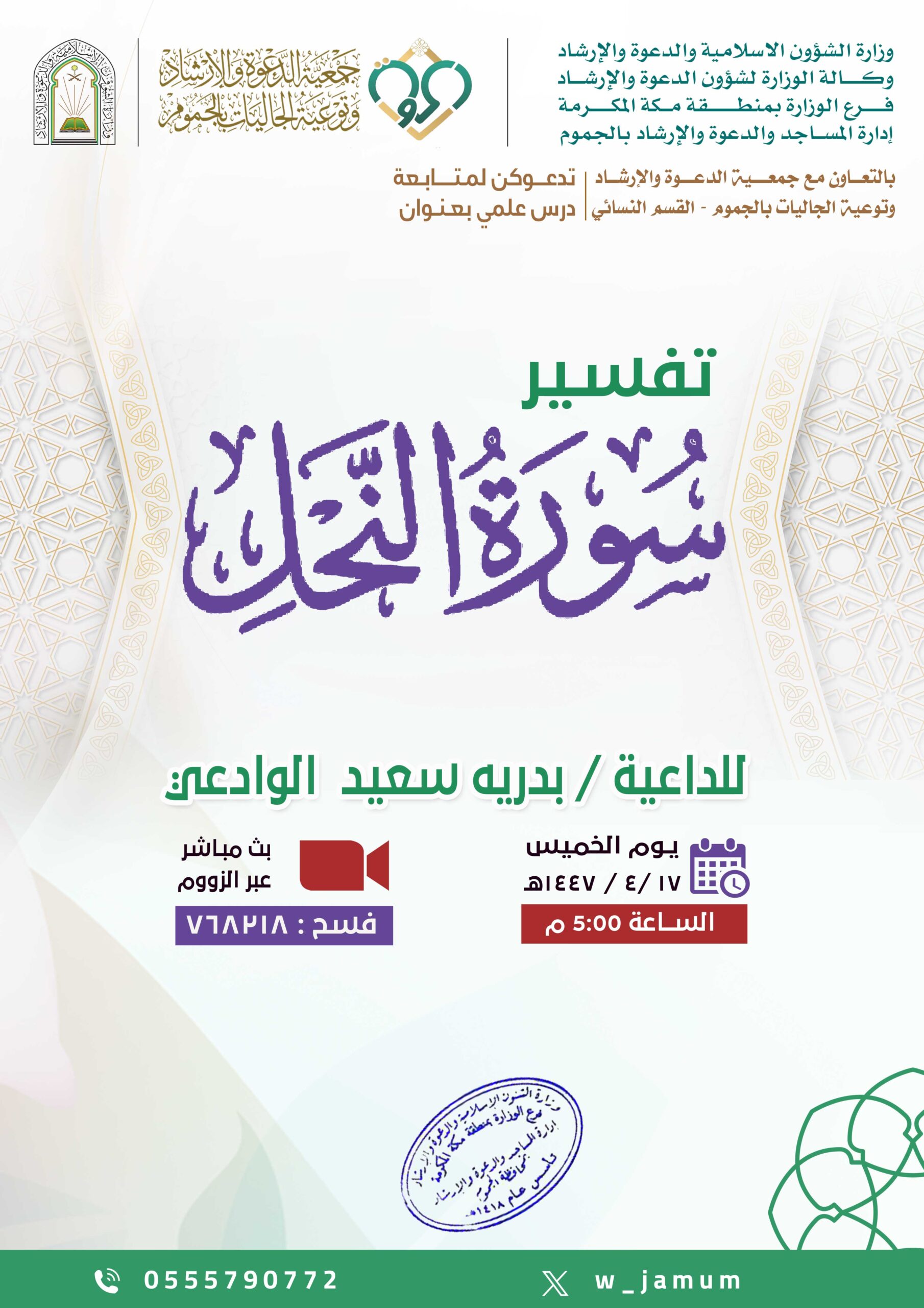 يسر فرع وزارة الشؤون الإسلامية والدعوة والإرشاد بمنطقة مكة المكرمة وإدارة المساجد والدعوة والإرشاد بمحافظة الجموم بالتعاون مع جمعية الدعوة والإرشاد وتوعية الجاليات بمحافظة الجموم – القسم النسائي أن يقدم لكم درس علمي بعنوان
