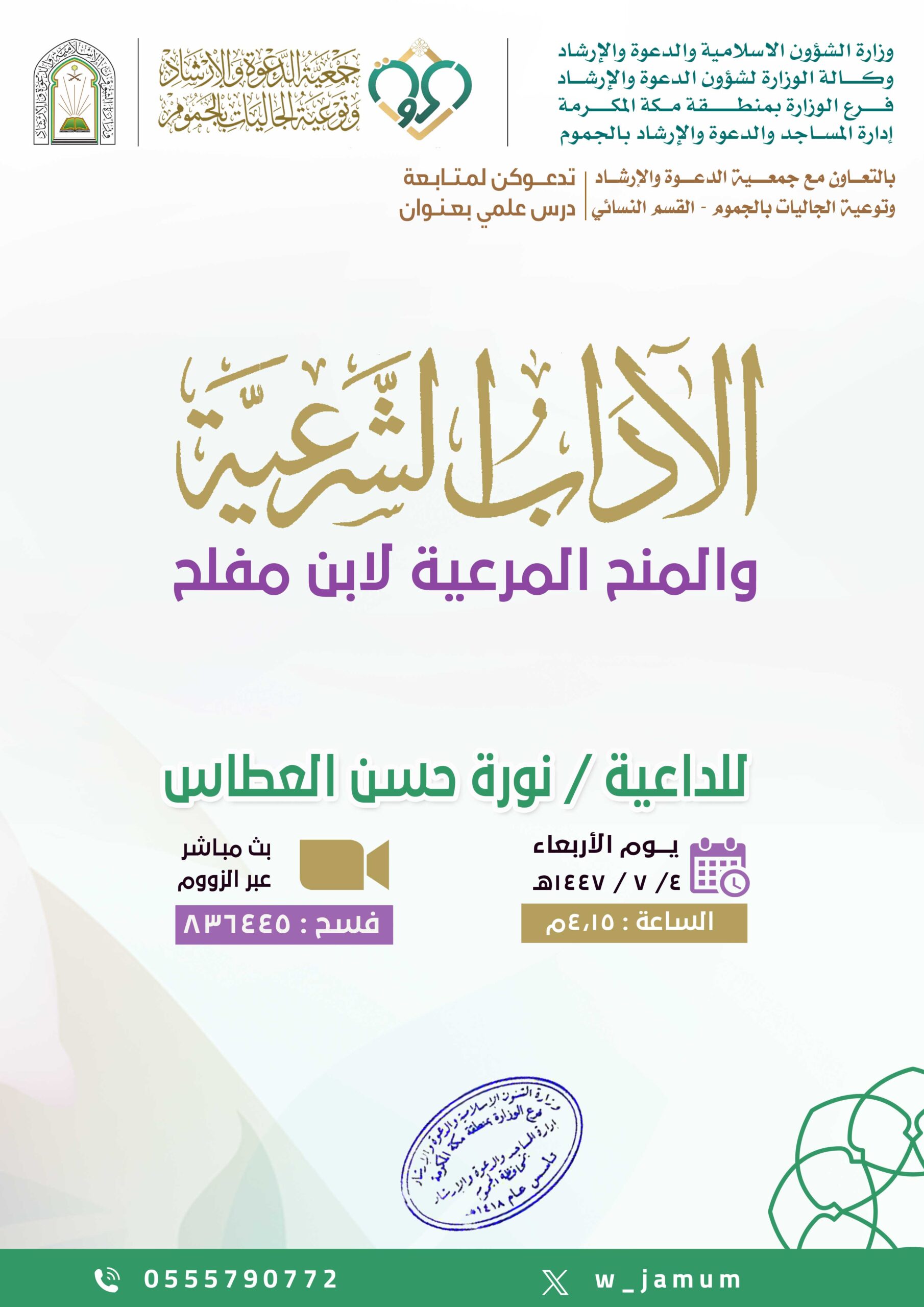 يسر فرع وزارة الشؤون الإسلامية والدعوة والإرشاد بمنطقة مكة المكرمة وإدارة المساجد والدعوة والإرشاد بمحافظة الجموم بالتعاون مع جمعية الدعوة والإرشاد وتوعية الجاليات بمحافظة الجموم – القسم النسائي أن يقدم لكم درس علمي بعنوان