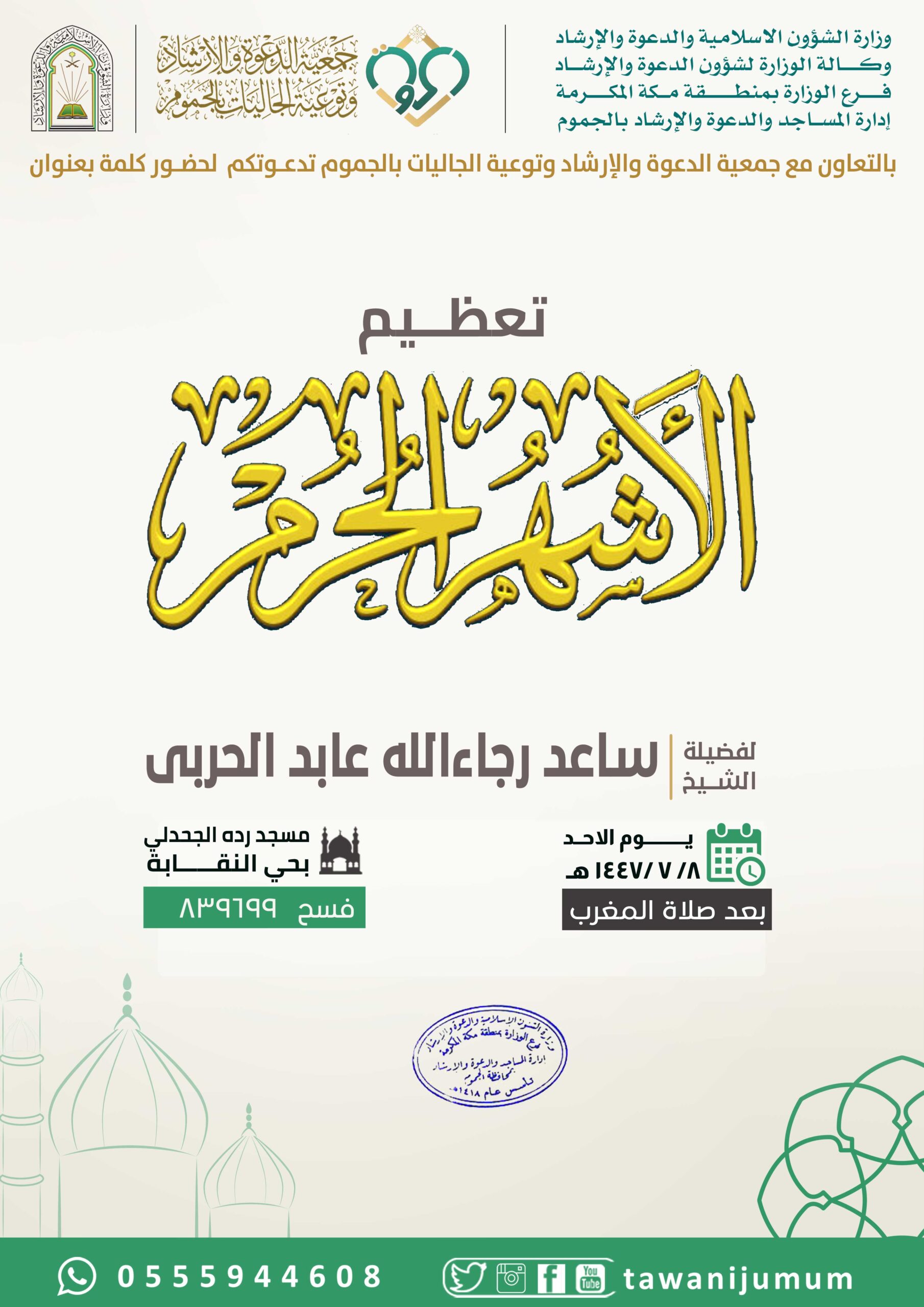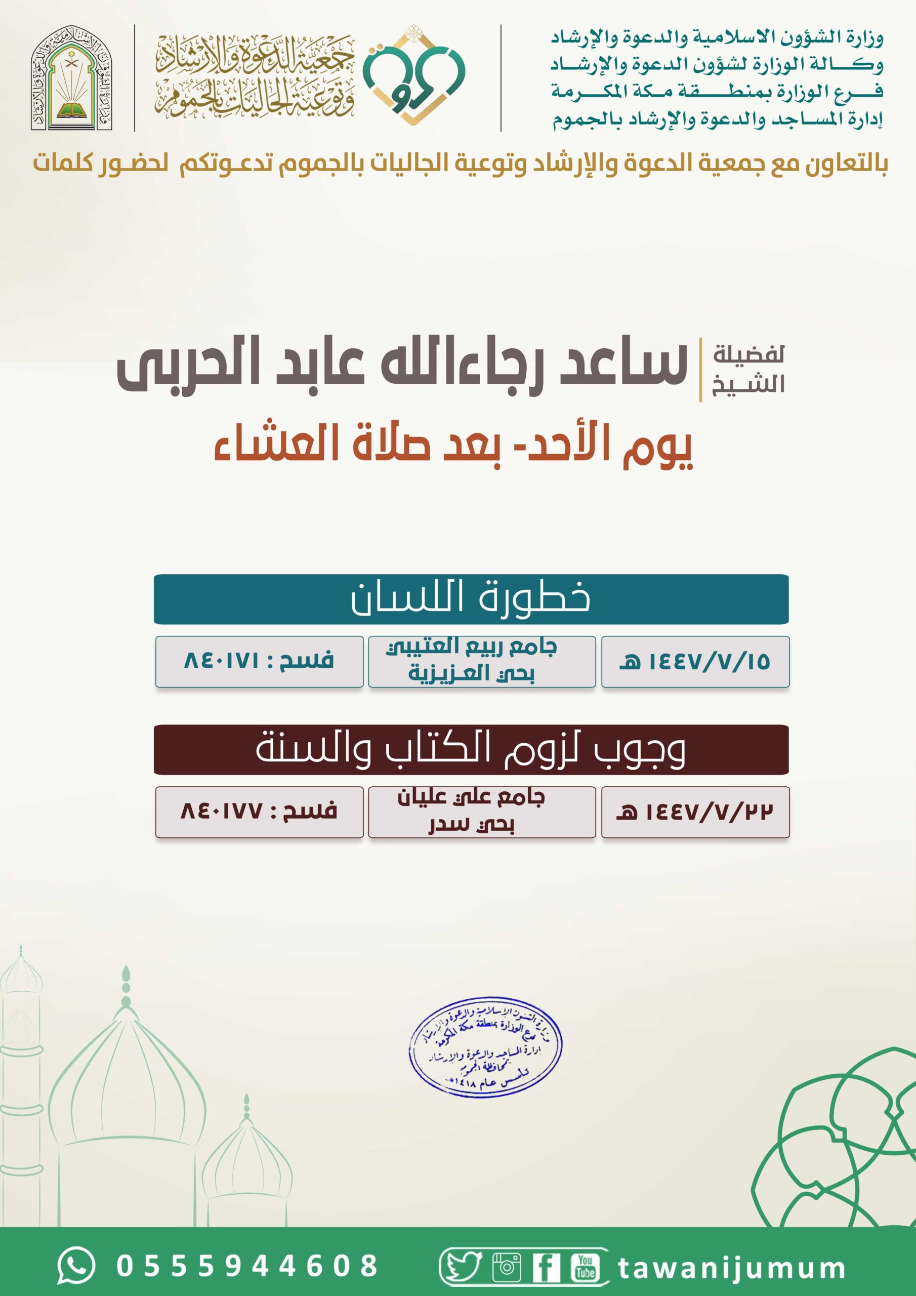 يسر فرع وزارة الشؤون الإسلامية والدعوة والإرشاد بمنطقة مكة المكرمة وإدارة المساجد والدعوة والإرشاد بمحافظة الجموم بالتعاون مع جمعية الدعوة والإرشاد وتوعية الجاليات بمحافظة الجموم أن تقدم لكم سلسلة كلمات بعنوان