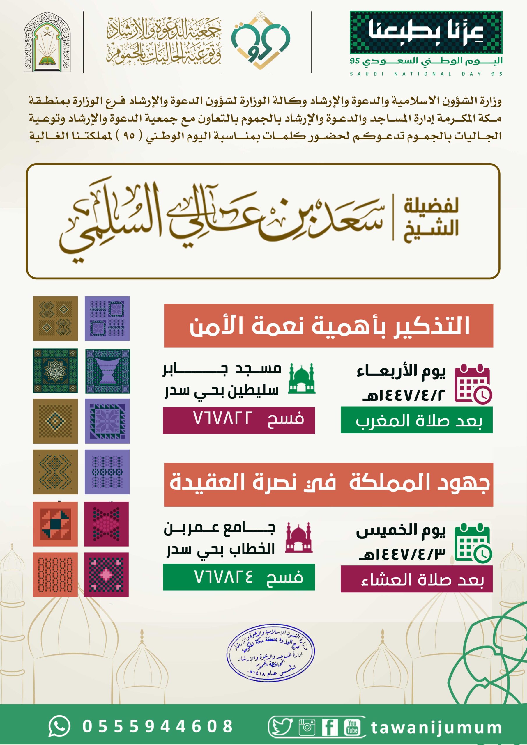 يسر فرع وزارة الشؤون الإسلامية والدعوة والإرشاد بمنطقة مكة المكرمة وإدارة المساجد والدعوة والإرشاد بمحافظة الجموم بالتعاون مع جمعية الدعوة والإرشاد وتوعية الجاليات بمحافظة الجموم أن تقدم لكم كلمات بمناسبة اليوم الوطني 95 لمملكتنا الغالية بعنوان