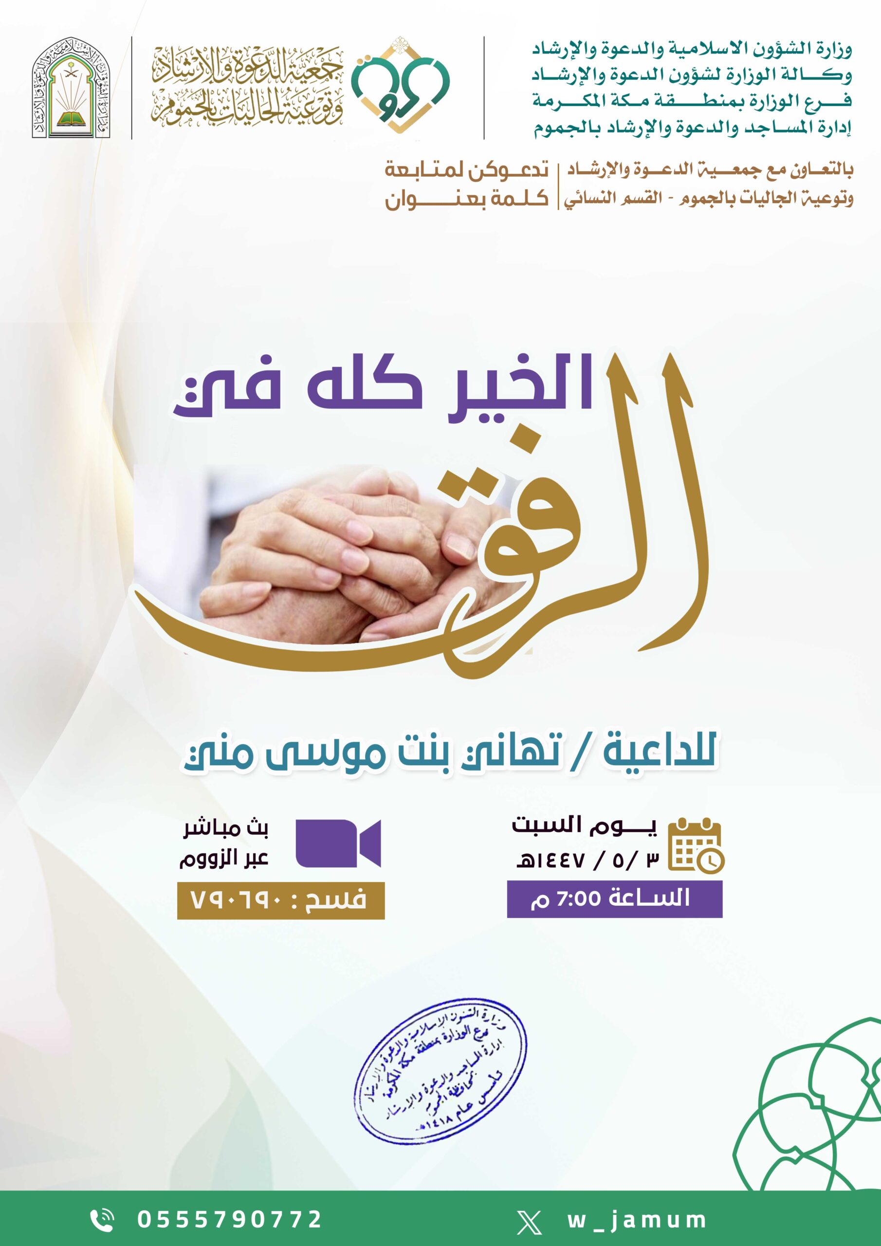 يسر فرع وزارة الشؤون الإسلامية والدعوة والإرشاد بمنطقة مكة المكرمة وإدارة المساجد والدعوة والإرشاد بمحافظة الجموم بالتعاون مع جمعية الدعوة والإرشاد وتوعية الجاليات بمحافظة الجموم – القسم النسائي  أن يقدم لكم كلمة بعنوان