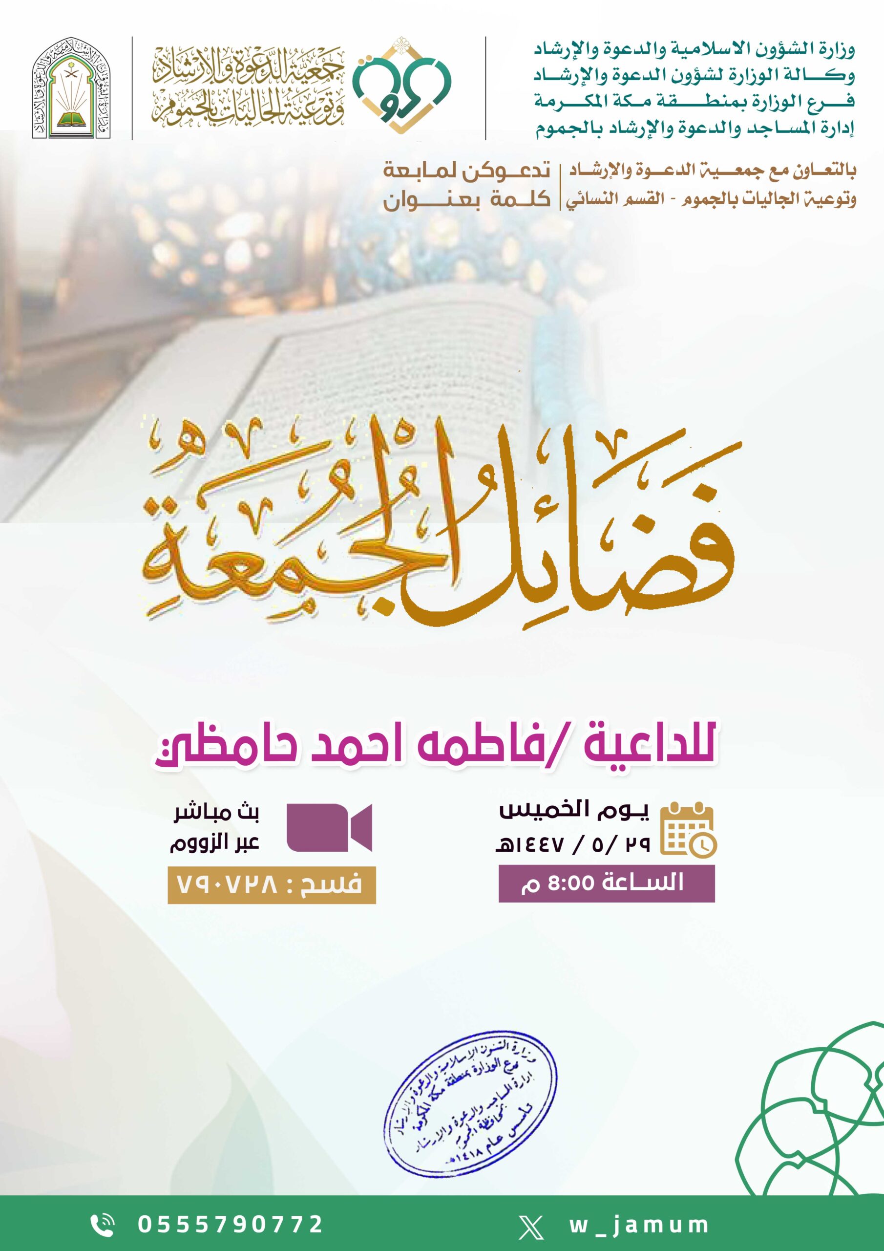 يسر فرع وزارة الشؤون الإسلامية والدعوة والإرشاد بمنطقة مكة المكرمة وإدارة المساجد والدعوة والإرشاد بمحافظة الجموم بالتعاون مع جمعية الدعوة والإرشاد وتوعية الجاليات بمحافظة الجموم – القسم النسائي أن يقدم لكم كلمة بعنوان