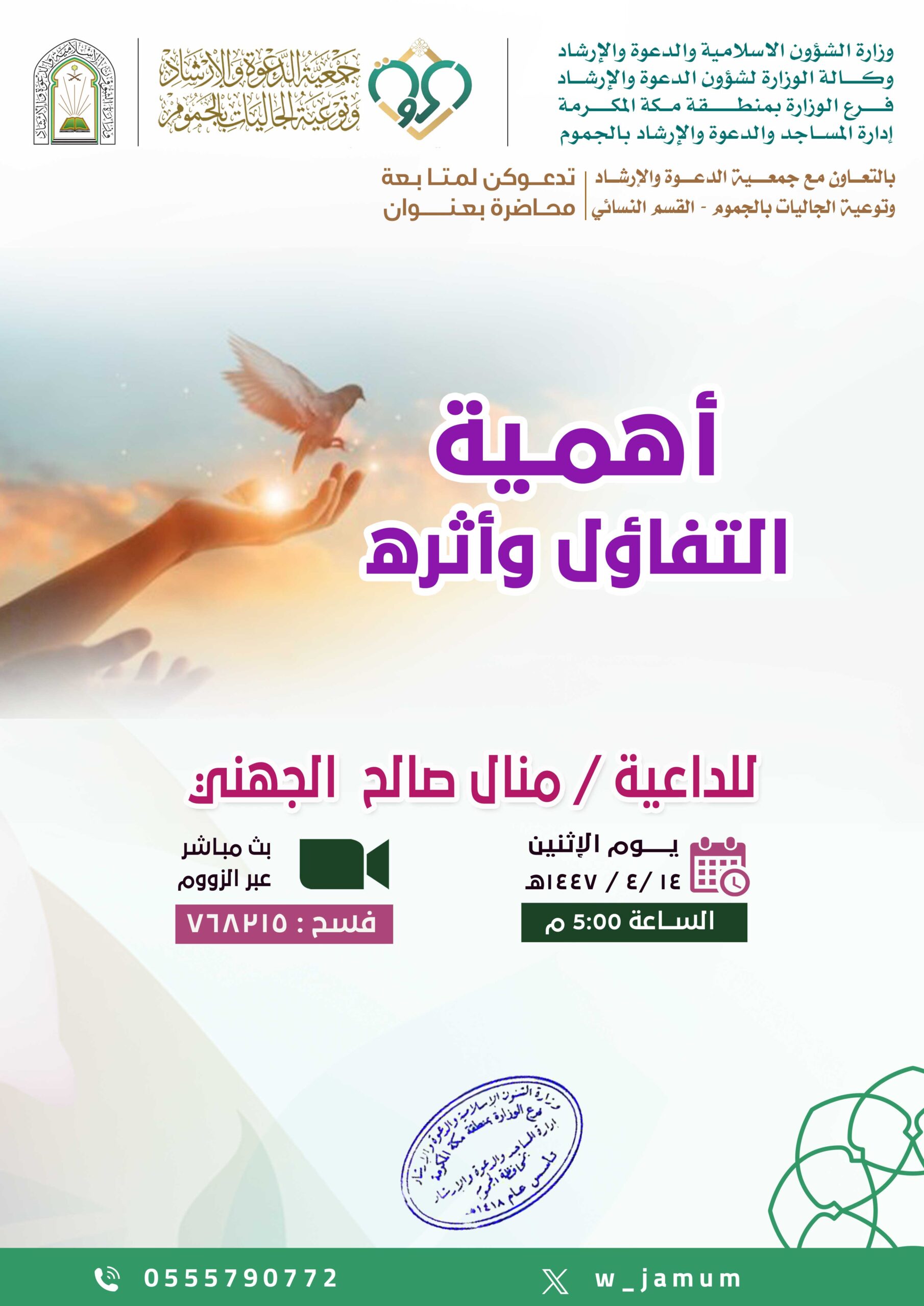 يسر فرع وزارة الشؤون الإسلامية والدعوة والإرشاد بمنطقة مكة المكرمة وإدارة المساجد والدعوة والإرشاد بمحافظة الجموم بالتعاون مع جمعية الدعوة والإرشاد وتوعية الجاليات بمحافظة الجموم – القسم النسائي  أن يقدم لكم محاضرة بعنوان