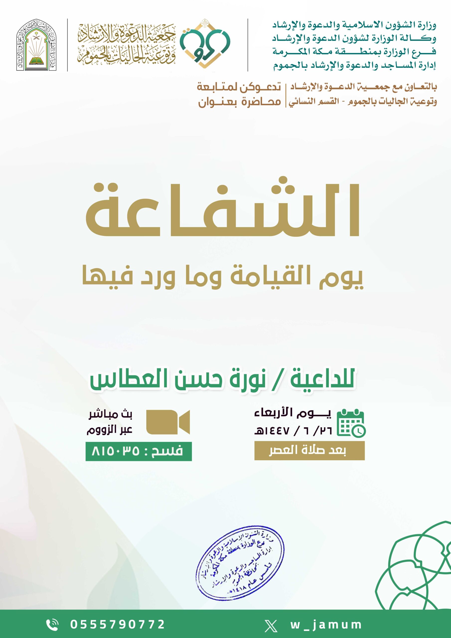 يسر فرع وزارة الشؤون الإسلامية والدعوة والإرشاد بمنطقة مكة المكرمة وإدارة المساجد والدعوة والإرشاد بمحافظة الجموم بالتعاون مع جمعية الدعوة والإرشاد وتوعية الجاليات بمحافظة الجموم – القسم النسائي أن يقدم لكم محاضرة بعنوان
